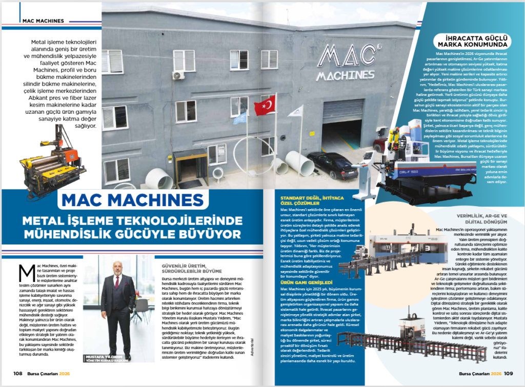 Metal işleme teknolojileri alanında yerli mühendislik gücüyle geliştirdiği yüksek teknolojili çözümlerle sektörde öne çıkan Mac Machines, Bursa iş dünyasının önemli yayınlarından biri olan Bursa Çınarları 2026 baskısında yer aldı.